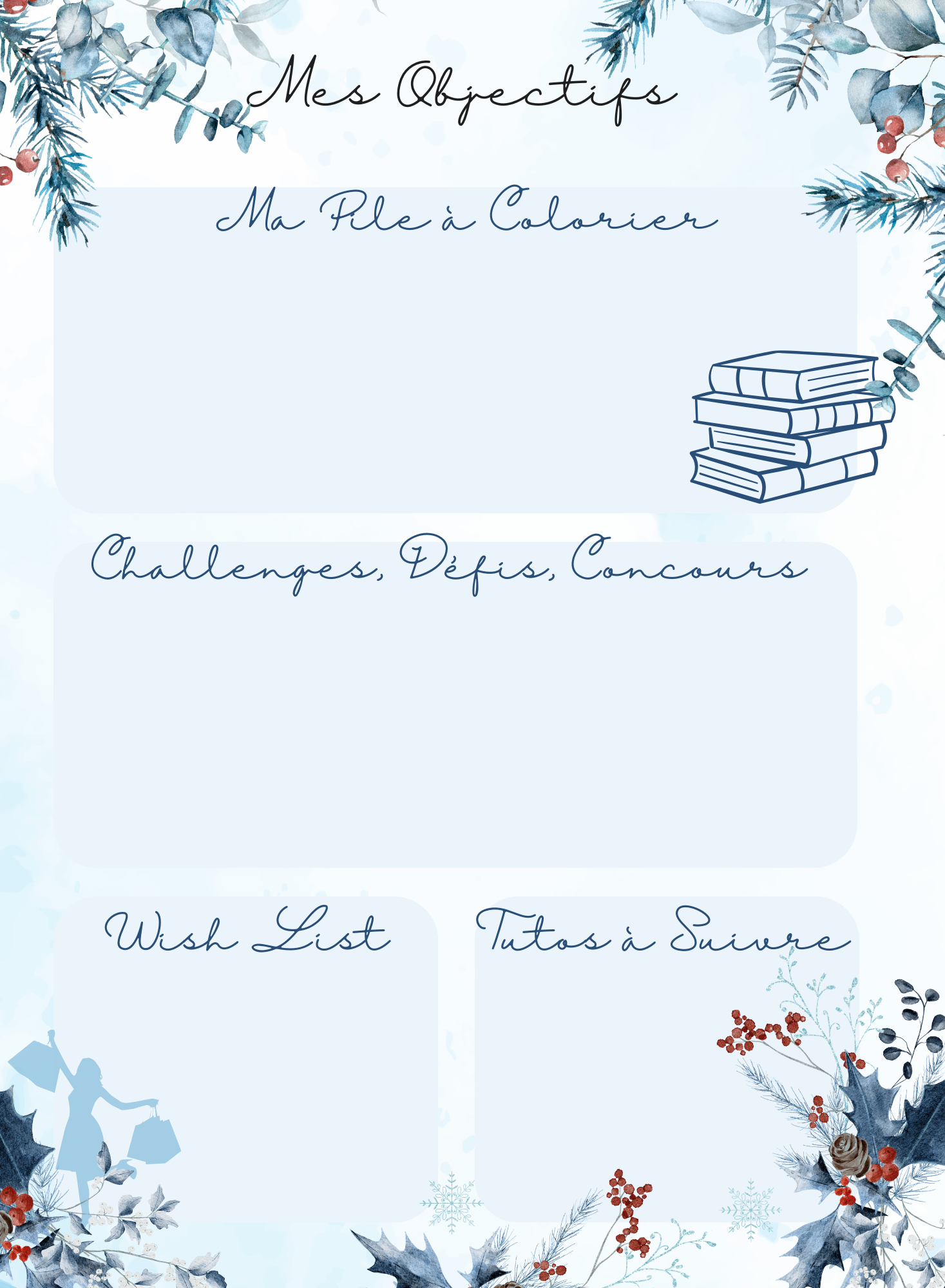 - At the start of each month: organize yourself with the Objectives section indicating: your PAC (coloring pile), your challenges/challenges/competitions, your Wish List, the Tutorials to follow & a page dedicated to your projects and desires.